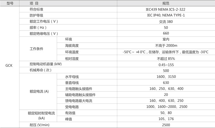 GCK低壓抽出式開(kāi)關(guān)柜,主要是由一些組合式電動(dòng)機(jī)控制單元,和其它功能單元組合而成。這些單元以上下重疊的方式安裝在封閉的金屬柜體內(nèi)。用設(shè)置在柜體上方的水平母線,將每個(gè)柜體聯(lián)結(jié)在一起,同一柜體的功能單元?jiǎng)t并聯(lián)在垂直母線上。柜體共分水平母線區(qū)、垂直母線區(qū)、電纜區(qū)和設(shè)備安裝區(qū)等四個(gè)互相隔離區(qū)域,功能單元分別安裝在各自的小室內(nèi),當(dāng)任何一個(gè)功能單元發(fā)生事故時(shí),均不影響其它單元,防止事故擴(kuò)大。本產(chǎn)品符合JB/T9661-1999標(biāo)準(zhǔn)。該產(chǎn)品采用IEC114規(guī)定的IP40防護(hù)等級(jí),當(dāng)所有的門和護(hù)板關(guān)閉時(shí),或門開(kāi)啟時(shí)以及功能單元外于移出位置時(shí),均能達(dá)到相應(yīng)的防護(hù)等級(jí),這樣可確保人身安全。該產(chǎn)品設(shè)置有完善可靠的接地系統(tǒng)和保護(hù)電路,所有功能單元均能按規(guī)定的性能要求,分?jǐn)喽搪冯娏?,進(jìn)線單元具有三段保護(hù)特性。因此,可以保證供電的可靠性,和設(shè)備與系統(tǒng)的安全。所有功能單元,均可通過(guò)接口件與PC線板(可編程序控制器)或微處理機(jī)連結(jié),作為自動(dòng)控制系統(tǒng)的執(zhí)行單元,根據(jù)用戶需要還可以提供其它內(nèi)容的功能單元和功能組合,該產(chǎn)品適用于交流380V,頻率50Hz的電路中。